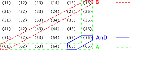 The trial is rolling two distinguishable dice (marked for example as die number 1 and die number 2), we have the sample space containing of 36 elements Ω = {(i,j) : i, j = 1, 2, ...6} where, obviously, (i,j) is an elementary event indicating that i pips have been obtained after the first roll and j pips after the second, see Figure 13.2.1.